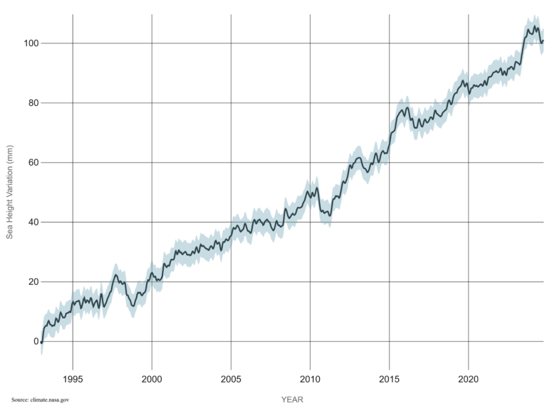 Die Messungen der NASA zeigen einen Meeresspiegelanstieg von etwa 3,3 cm pro Jahrzehnt zwischen 1993 und 2023. Auch dieser Wert liegt gegen 50% unter den Vorhersagen.